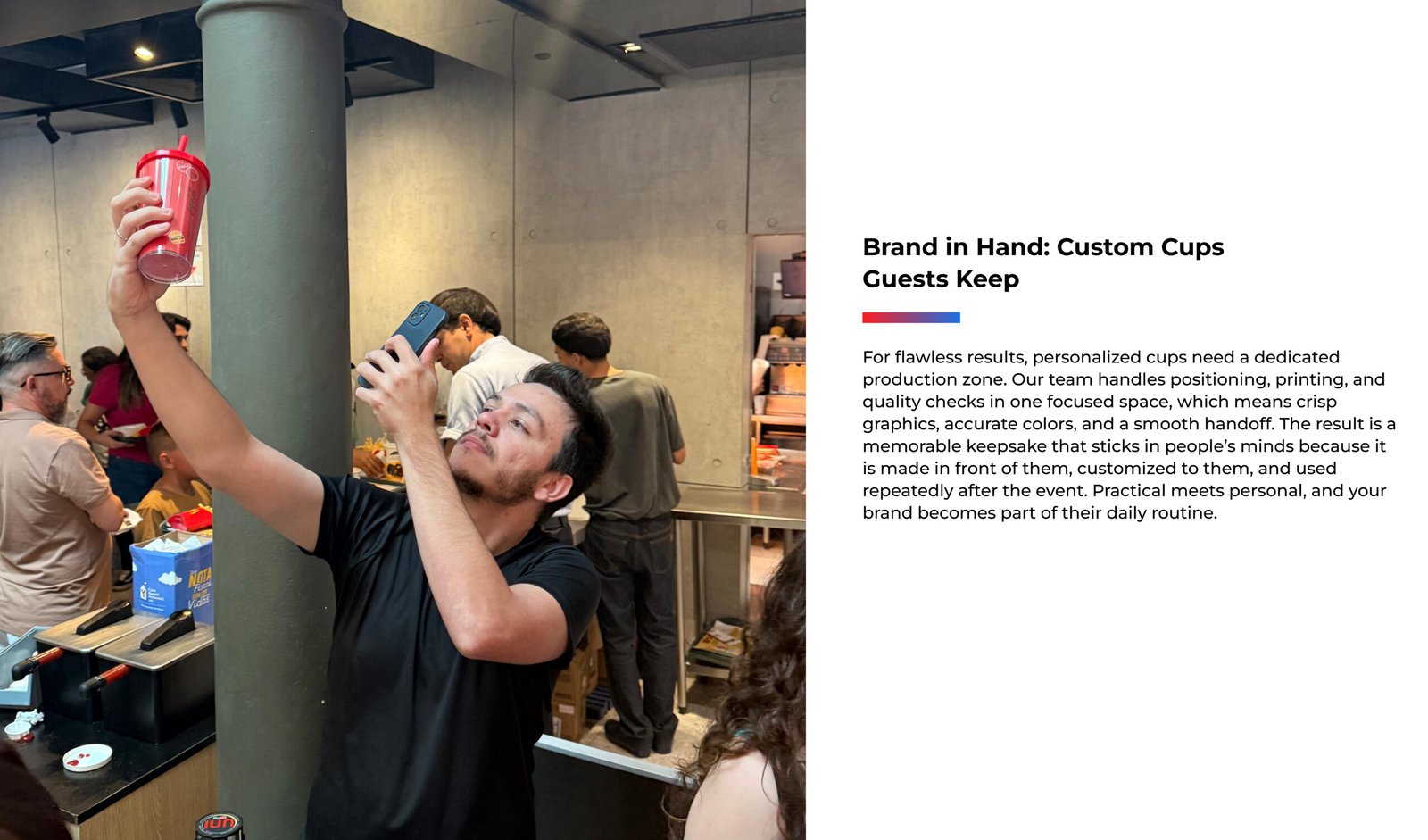 A ativação com copos personalizados é uma forma diferenciada de eternizar a marca do cliente, onde criamos um brinde único durante o evento.